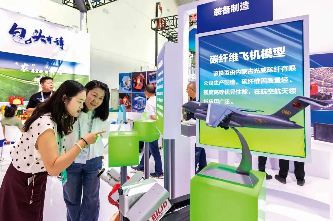 第五届中国—蒙古国博览会在呼和浩特举办,参观者在包头馆了解碳纤维飞机模型。
